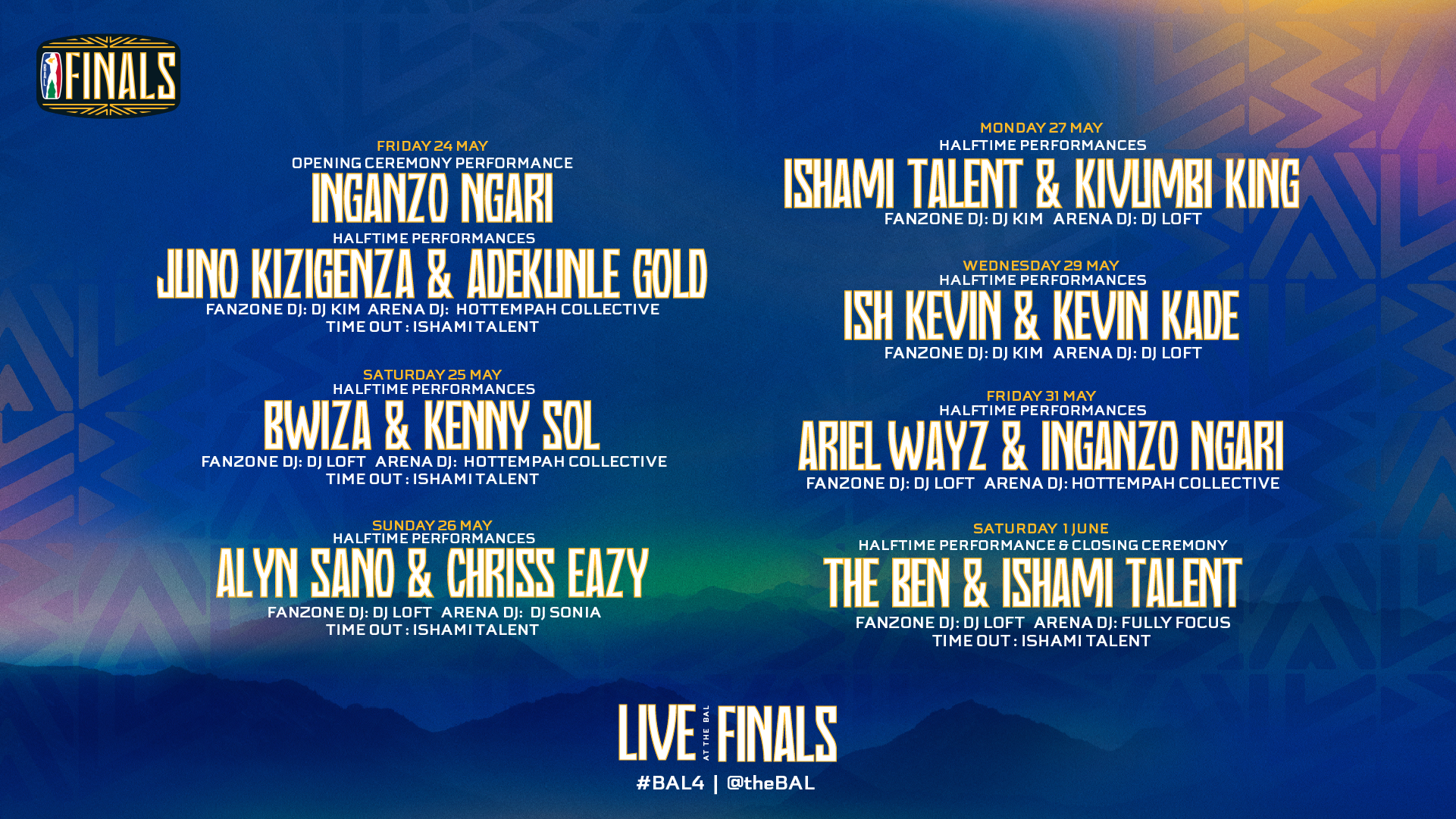 Starting May 24, every game will showcase diverse performers catering to all age groups; Adekunle Gold, Juno Kizigenza, Alyn Sano & Chris Eazy will perform during the opening weekend. Kivumbi King, Ariel Wayz & The Ben will close the Finals with halftime performances during the closing weekend May 31 - June 1, 2024.
